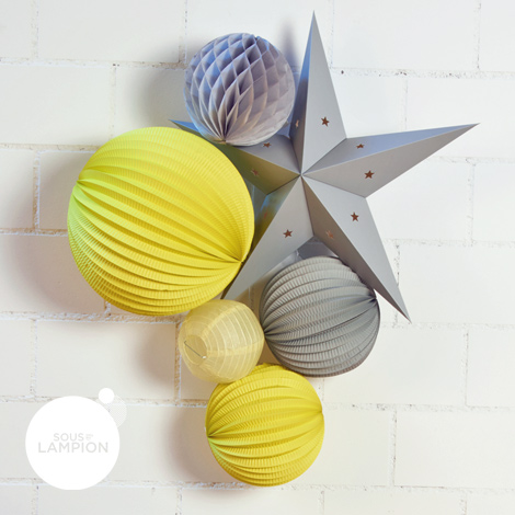 A pretty set of paper lanterns, honeycomb balls, paper...