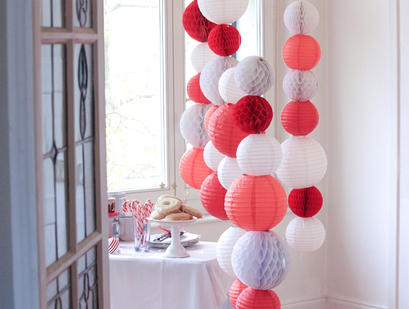 Pour suspendre des lanternes au dessus d'un buffet de Noël, il vous suffit d'identifer tous les points possibles d'accroche dans votre pièce (poutres, crochets existants, structure de fenêtres) et de tirer du fil de pêche ou de la cordelette.